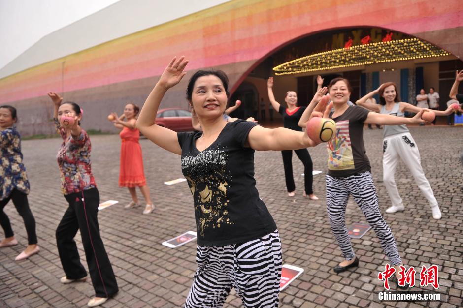 9月26日,随着歌曲《小苹果》节奏的响起,重庆洋人街广场上大妈们举着iphone6模型跳舞。iphone6模型上写着:“抢苹果不如抢健康、我们不是果粉不跟风、文明购买理性消费”等标语。大妈们想利用这样的行为艺术方式呼吁民众树立正确的消费观。图为大妈们拿着写有“6”的苹果跳着舞蹈。陈超 摄