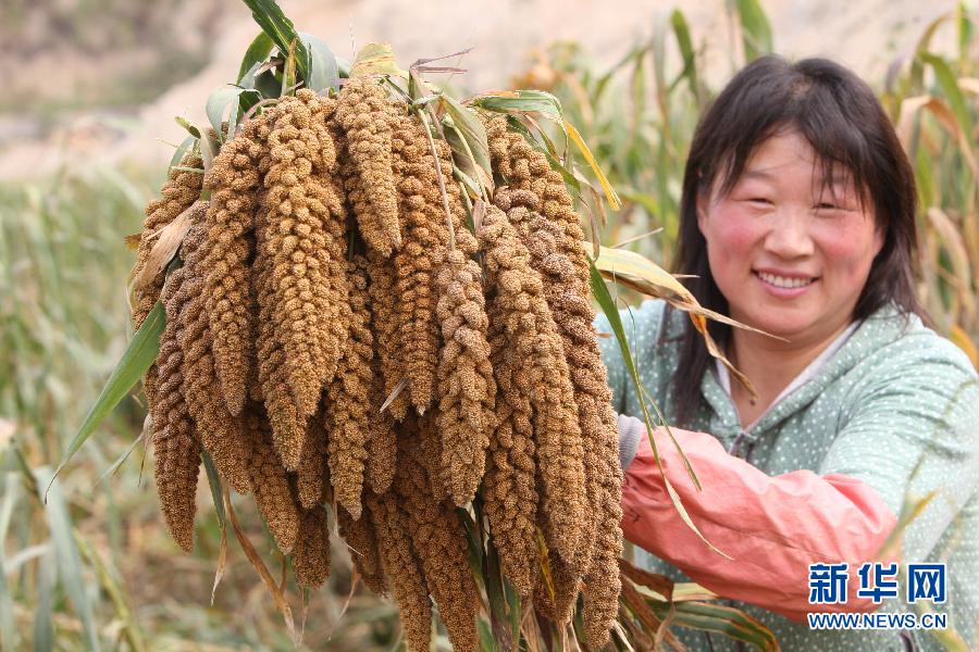 9月27日, 农民在田间展示有机谷子。近日,山东烟台招远市蚕庄镇林家村盛润种植专业合作社的500余亩有机谷子喜获丰收。依靠严格的有机稻谷标准化栽培技术规程,并在播种、夏管、秋收等环节层层把关,盛润种植专业合作社实现谷子增产增收、农民受益。预计今年有机谷子亩产可达460余公斤,每亩比去年增产200多公斤,增收3000余元。新华社发(申吉忠 摄)