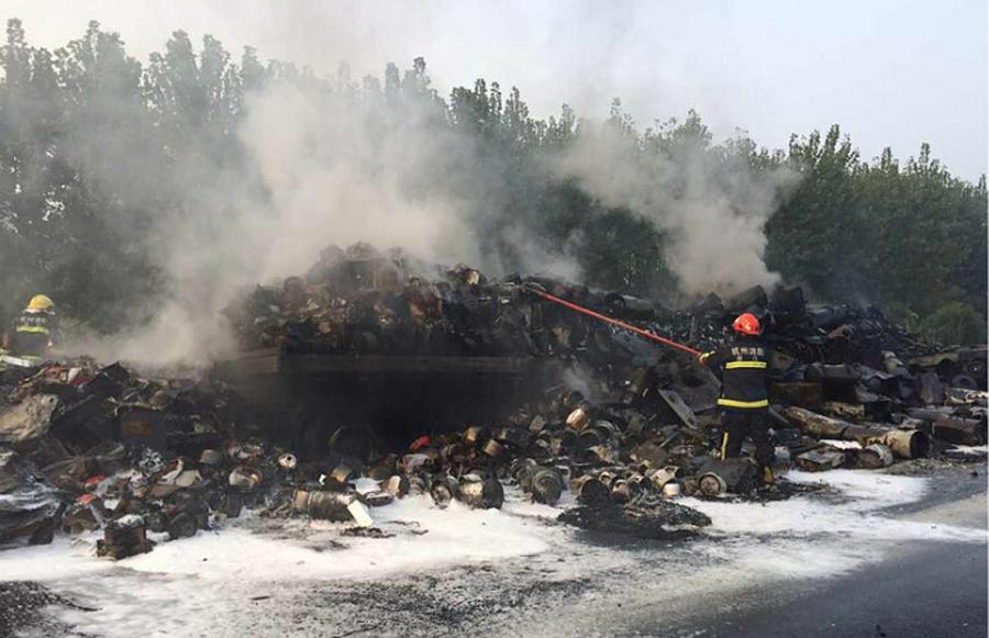 浙江一高速两辆载油漆大货车追尾 场面惨烈
