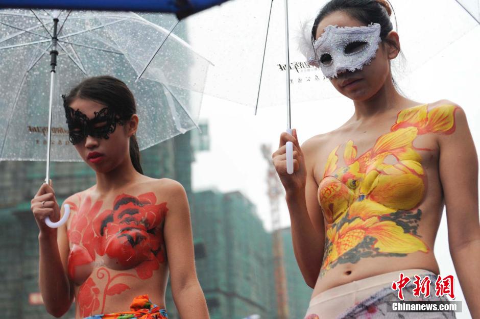 9月28日,河南周口市,两名人体彩绘模特在T台上走秀。当日,当地一家地产商为庆典活动组织人体彩绘走秀,吸引了现场数千观众围观。中新社发 杨正华 摄