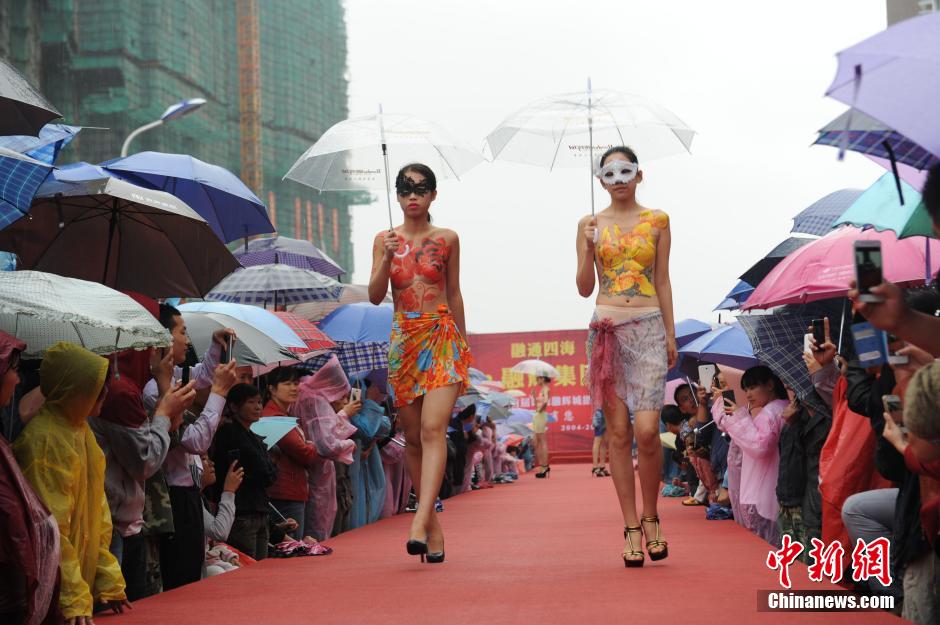 9月28日,河南周口市,两名人体彩绘模特在T台上走秀。当日,当地一家地产商为庆典活动组织人体彩绘走秀,吸引了现场数千观众围观。中新社发 杨正华 摄