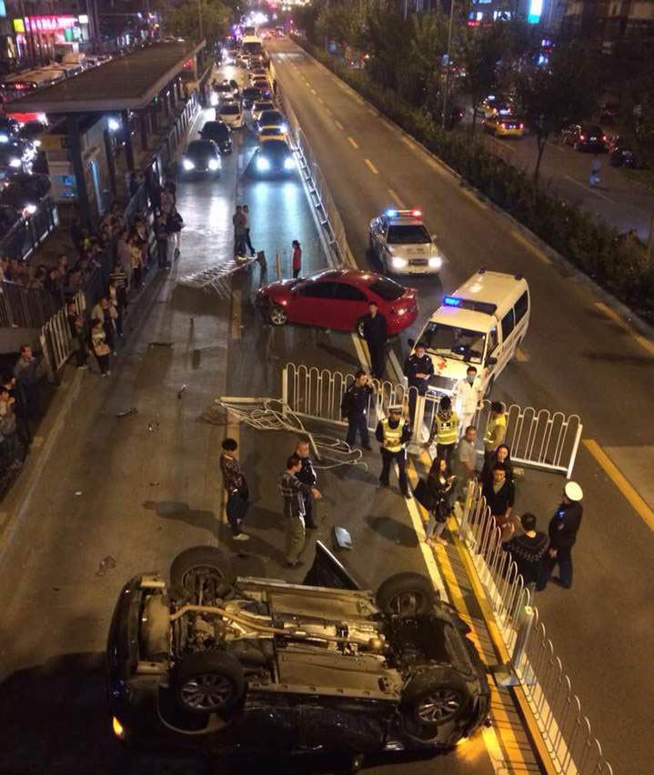 北京朝阳路上两车对向冲撞致一车翻车 现场惨烈(组图)