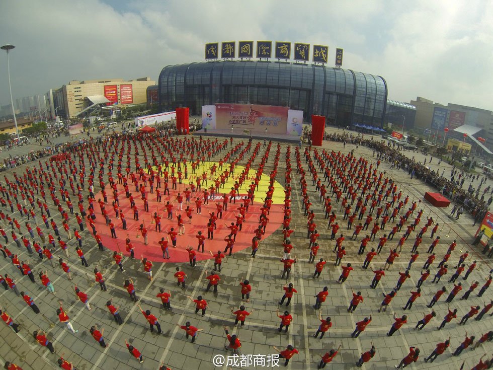 据成都商报官方微博消息,10月1日,“健康中国·舞比幸福-庆贺中华人民共和国成立65周年万人齐跳小苹果广场舞比赛”总决赛在成都国际商贸城举行,现场叔叔嬢嬢们个个激情高涨,还有小朋友也加入“大军”。经过激烈角逐,来自金牛区的彩云舞蹈队舞队斩获冠军头衔,抱走5000元大奖!图为参赛队伍进行表演,人数近千人。