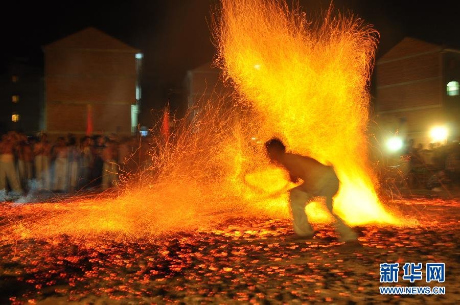 在地处浙中深山的浙江省金华市磐安县,至今保留着有千年历史的民俗活动“炼火”。当晚,磐安县双峰乡东坑村的村民用120箩筐木炭在平地上燃起直径10米宽的火坛,14名大汉光膀赤脚,手持铲子,围着一大堆烧得通红的木炭奔走穿梭,场面惊险。据介绍,当地人用“炼火”辟邪、祈福,表达对祖先的敬意。新华社发(孔德宾 摄)