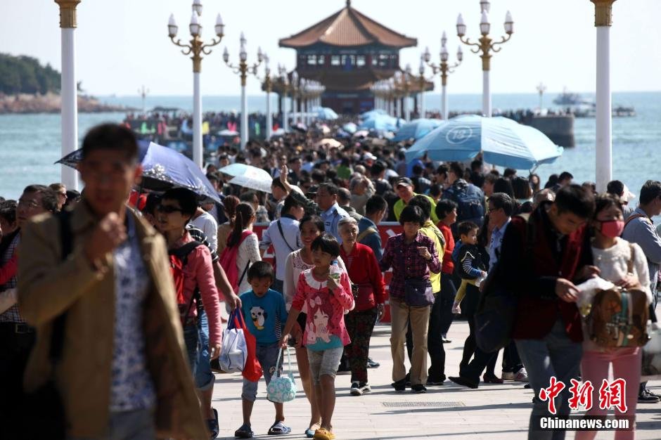 10月3日,十一长期的第三天,青岛旅游进入高峰期,前海一线,人流如织,栈桥变成人桥。 中新社发 徐崇德 摄