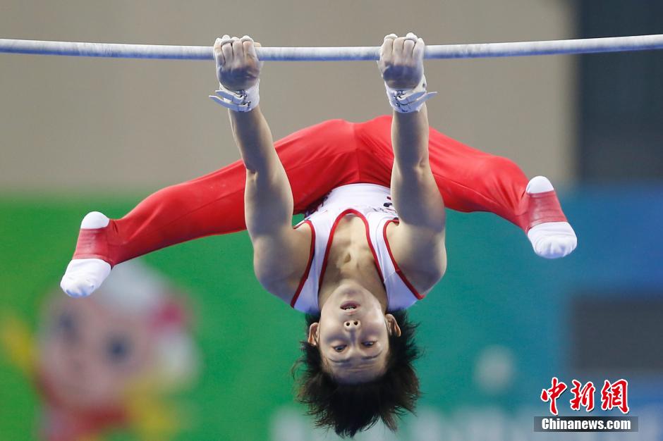 图为日本选手加藤凌平在单杠比赛中。中新社发 盛佳鹏 摄