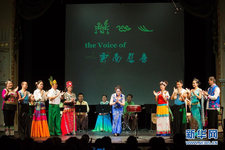 10月7日,在匈牙利首部布达佩斯,傣族女高音歌唱家金小凤(中)率“云南声音”艺术团成员谢幕。当日,为庆祝中国和匈牙利建交65周年,一台充满浓郁民族风情的“云南声音”音乐会在李斯特音乐学院音乐厅举行。 新华社发(弗尔季·奥蒂洛摄)