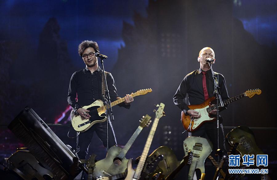 10月7日,汪峰(左)和帕尔哈提在总决赛中合作演唱。当日,第三季《中国好声音》总决赛在北京首都体育馆举行,余枫、张碧晨、秦宇子和帕尔哈提角逐“年度好声音”桂冠。 新华社发