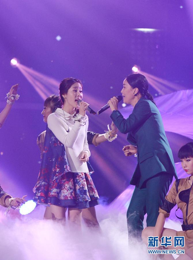 10月7日,张碧晨(左)和那英在总决赛中合作演唱。当日,第三季《中国好声音》总决赛在北京首都体育馆举行,余枫、张碧晨、秦宇子和帕尔哈提角逐“年度好声音”桂冠。 新华社发
