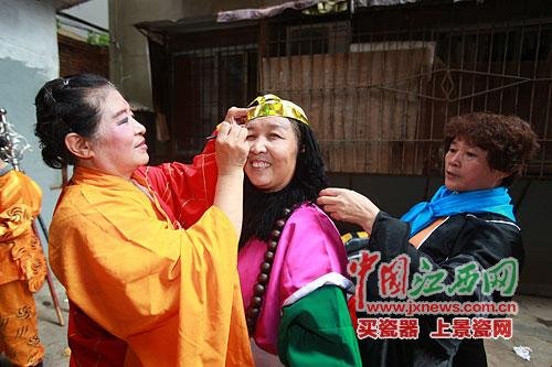 唐僧扮演者骆华告诉记者,四人都60多岁了,起初大家组成了这个女版唐僧师徒组合,只为图个锻炼身体,没想到竟然火了起来,长假期间几乎没有空闲的时间,不是被邀约去表演就是在去表演的路上。图为唐僧给沙僧化妆。