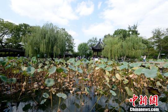 游客在苏州拙政园内观赏荷塘内的残荷景致。王思哲 摄