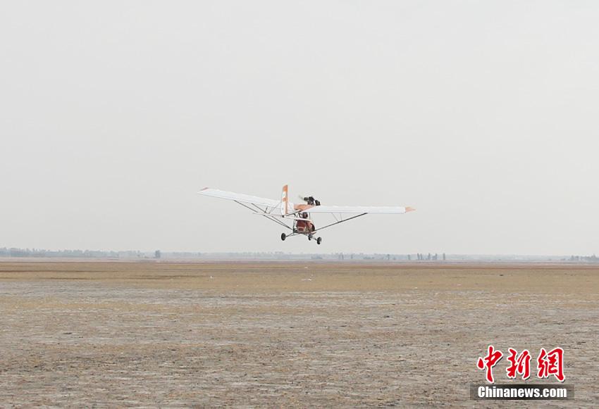 为纪念已故飞行员父亲,长春市民杨世军耗时2年花费15万元制造了一架小型飞机,翼展9.5米、机长5米、高2.7米、重110公斤。近日,他驾驶这架飞机成功完成试飞。杨世军介绍,此次试飞选择在长春市郊一处无人空旷地带,历时约54分钟,飞行高度在200米以内,共完成4个起降动作。张瑶 摄