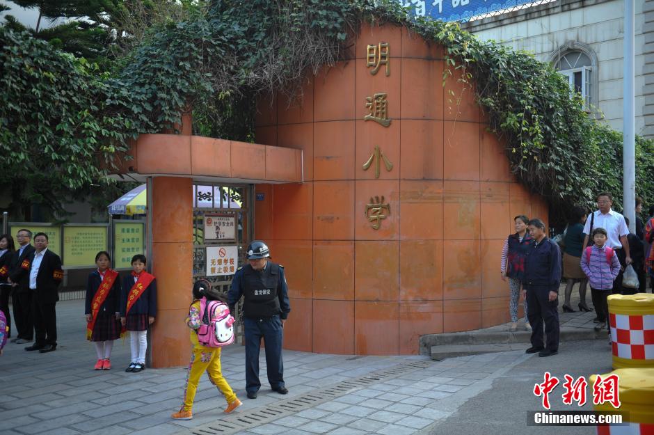 10月8日,校门口墙上挂的各种荣誉牌匾已经不见踪影。当日,国庆收假第一天,云南昆明明通小学恢复正常上课。9月26日,昆明市明通小学发生踩踏事故,造成学生6人死亡、26人受伤。 中新社发 刘冉阳 摄