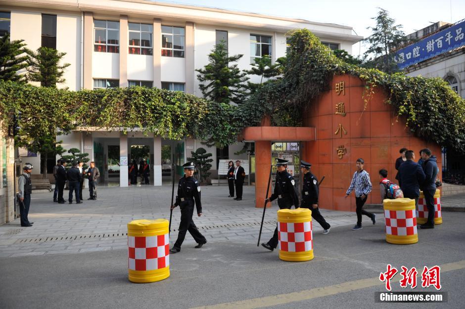 10月8日,学校门口站满了维持秩序的警察。当日是国庆收假第一天,云南昆明明通小学恢复正常上课。9月26日,昆明市明通小学发生踩踏事故,造成学生6人死亡、26人受伤。 中新社发 刘冉阳 摄
