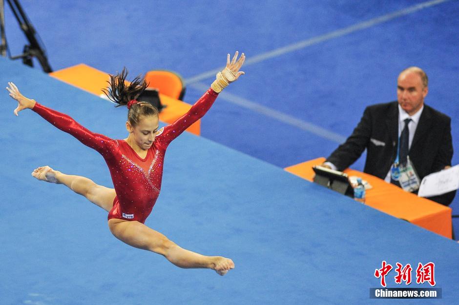 10月8日,第45届世界体操锦标赛女子团体决赛在广西南宁举行,美国队夺冠,中国与俄罗斯分列第二、三名。图为俄罗斯选手在比赛中。洪坚鹏 摄