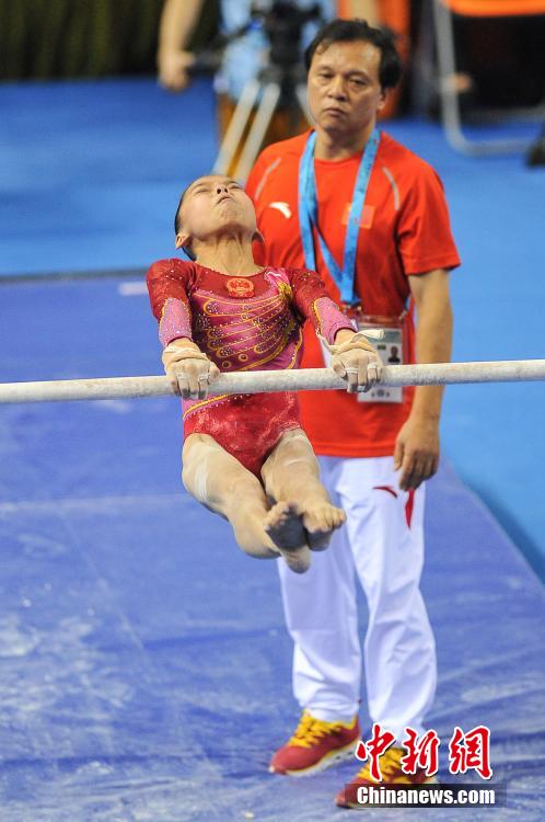 10月8日,第45届世界体操锦标赛女子团体决赛在广西南宁举行,美国队夺冠,中国与俄罗斯分列第二、三名。图为中国选手在比赛中。洪坚鹏 摄