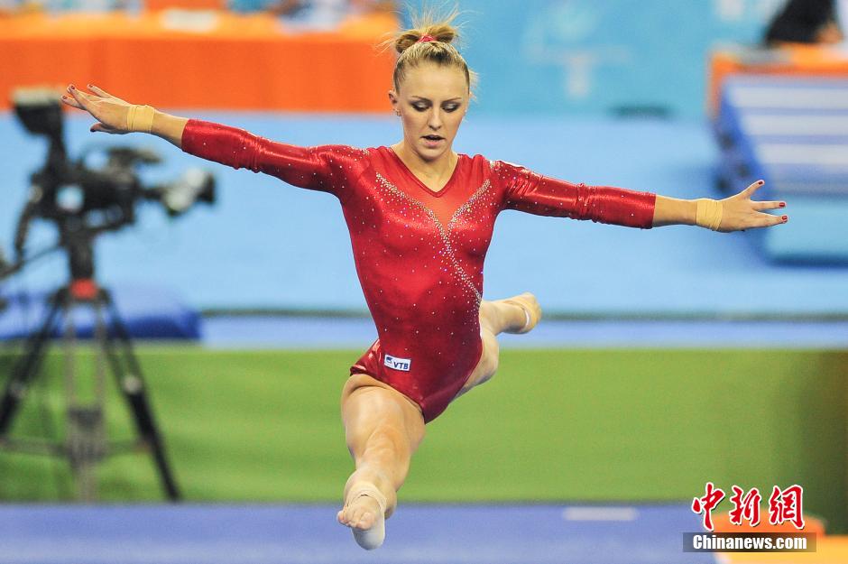 10月8日,第45届世界体操锦标赛女子团体决赛在广西南宁举行,美国队夺冠,中国与俄罗斯分列第二、三名。图为俄罗斯选手在比赛中。洪坚鹏 摄