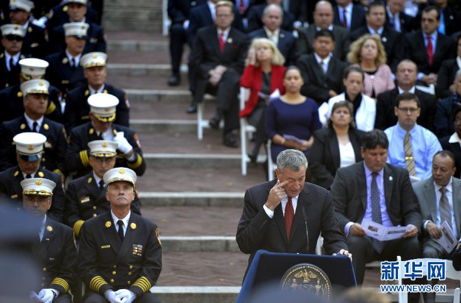 10月8日,纽约市长德布拉西奥在年度消防纪念活动中讲话。当日,美国纽约市举行第107届消防纪念活动,悼念在去年一年中因公殉职的4名消防员。消防员在美国是最受人们尊敬的职业之一,纽约市消防局每年都会举行纪念活动,悼念因公殉职的消防员。新华社记者王雷摄