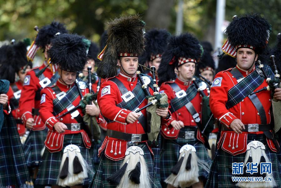 10月8日,身着传统服装的乐手在纽约参加年度消防纪念活动。当日,美国纽约市举行第107届消防纪念活动,悼念在去年一年中因公殉职的4名消防员。消防员在美国是最受人们尊敬的职业之一,纽约市消防局每年都会举行纪念活动,悼念因公殉职的消防员。新华社记者王雷摄