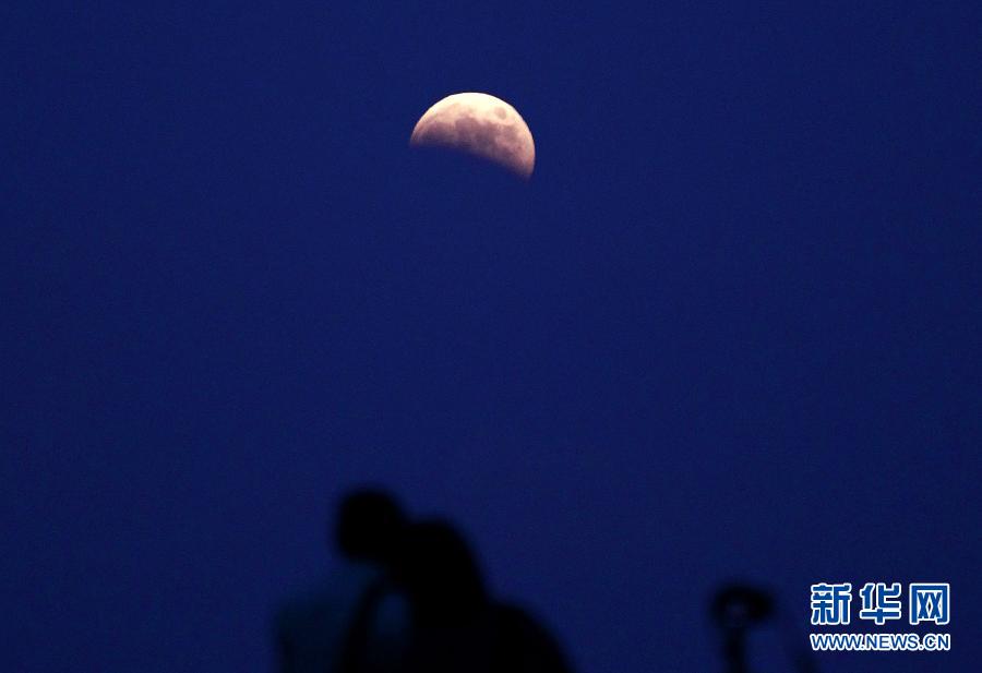 10月8日,摄影爱好者在上海东海大桥附近拍摄月食。当晚,月全食如约而至,颇具观赏效果的“红月亮”亮相天宇。 新华社记者 丁汀 摄