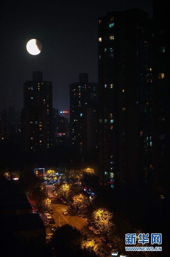 这是10月8日晚在重庆拍摄的月食(多重曝光)。当晚,月全食如约而至,颇具观赏效果的“红月亮”亮相天宇。 新华社记者刘潺摄