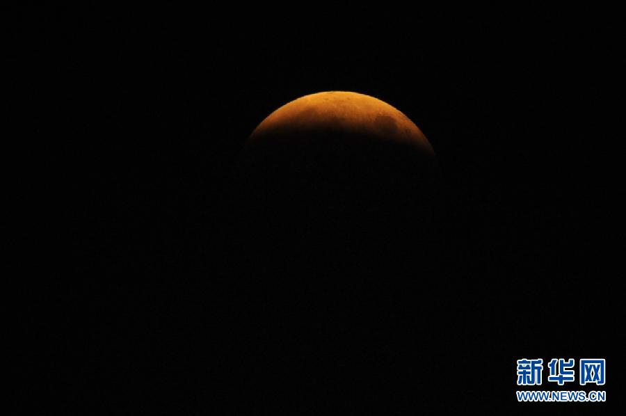 这是10月8日18时06分在浙江杭州西湖边拍摄的月亮。当晚,月全食如约而至,颇具观赏效果的“红月亮”亮相天宇。 新华社记者鞠焕宗摄