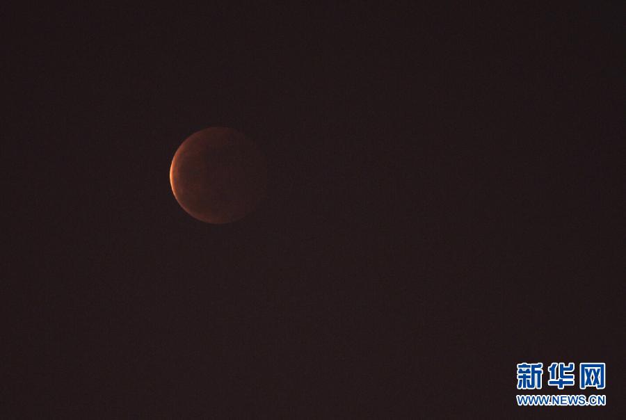 这是10月8日晚在海南海口市万绿园附近拍摄的月亮。当晚,月全食如约而至,颇具观赏效果的“红月亮”亮相天宇。 新华社发(杨冠宇 摄)