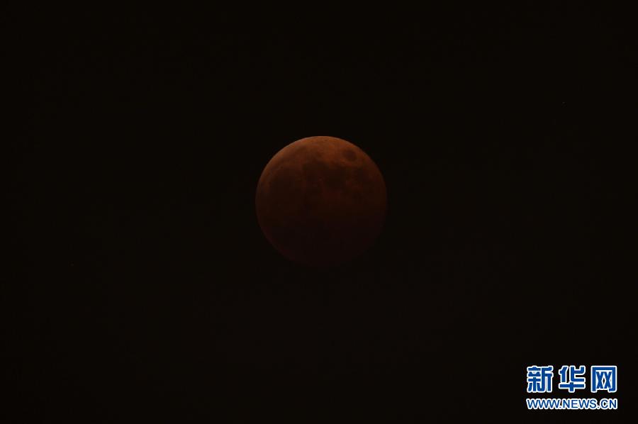 这是10月8日18时33分在浙江杭州西湖边拍摄的月亮。当晚,月全食如约而至,颇具观赏效果的“红月亮”亮相天宇。 新华社记者鞠焕宗摄