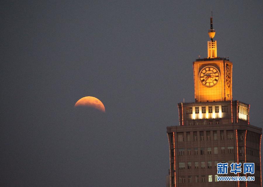 10月8日晚上在江苏宜兴拍摄的月食。当晚,月全食如约而至,颇具观赏效果的“红月亮”亮相天宇。 新华社发(丁焕新 摄)