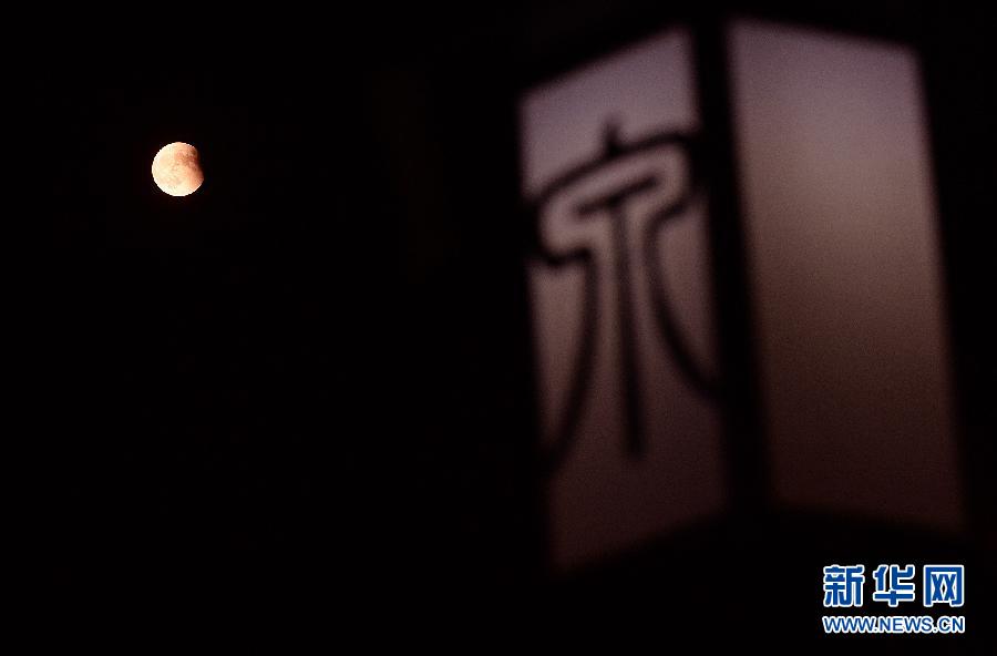 这是10月8日在山东济南街头拍摄的月食景色。当晚,月全食如约而至,颇具观赏效果的“红月亮”亮相天宇。 新华社记者 何俊昌 摄