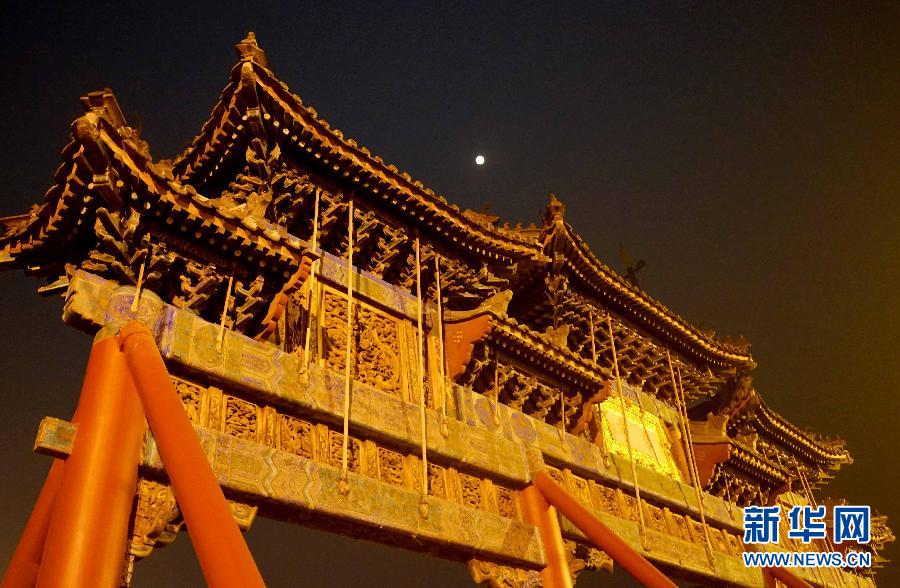 这是10月8日在北京颐和园东门外牌楼附近拍摄的月亮。当晚,月全食如约而至,颇具观赏效果的“红月亮”亮相天宇。 新华社记者 陈建力 摄