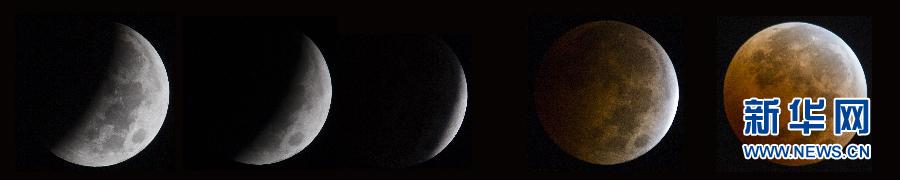 这是10月8日凌晨在美国洛杉矶拍摄的“红月亮”奇景(拼版图片)。天文专家表示,这次月全食是自今年4月15日开始的“连环四月食”的第二环,余下的两环将于2015年4月4日和2015年9月28日出现。发生月全食时,由于太阳光中波长较长的红光不容易被地球大气层散射,折射到躲在地球影子后面的月亮上,因此月全食期间的月亮就变成了红色,也就是平常所说的“红月亮”。新华社发(赵汉荣摄)