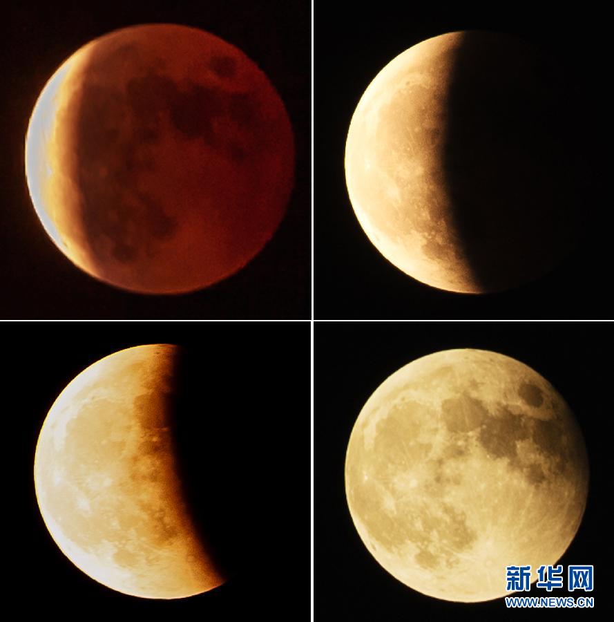 图为10月8日晚在江苏南京拍摄的月食过程(拼版照片)。当晚,月全食如约而至,颇具观赏效果的“红月亮”亮相天宇。 新华社记者李响摄