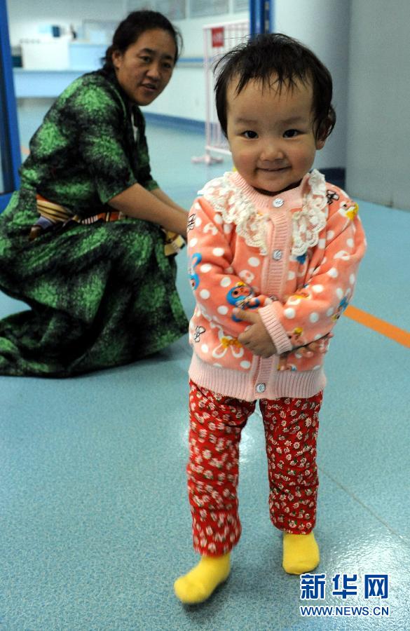 10月8日,首次术后的其美拉姆在母亲次旦卓玛的陪伴下在病房走廊里玩耍。受到社会各界关注的西藏先天性心脏病患儿其美拉姆于9月23日在北京安贞医院成功完成首次心脏介入手术后,恢复良好,第二次手术将于10月10日进行。自2004年以来,北京安贞医院小儿心脏内科副主任顾虹九进西藏,已在西藏参与和组织筛查了上万名先心病患儿,并在北京安贞医院为160多名西藏患儿实施了手术。新华社记者唐召明摄