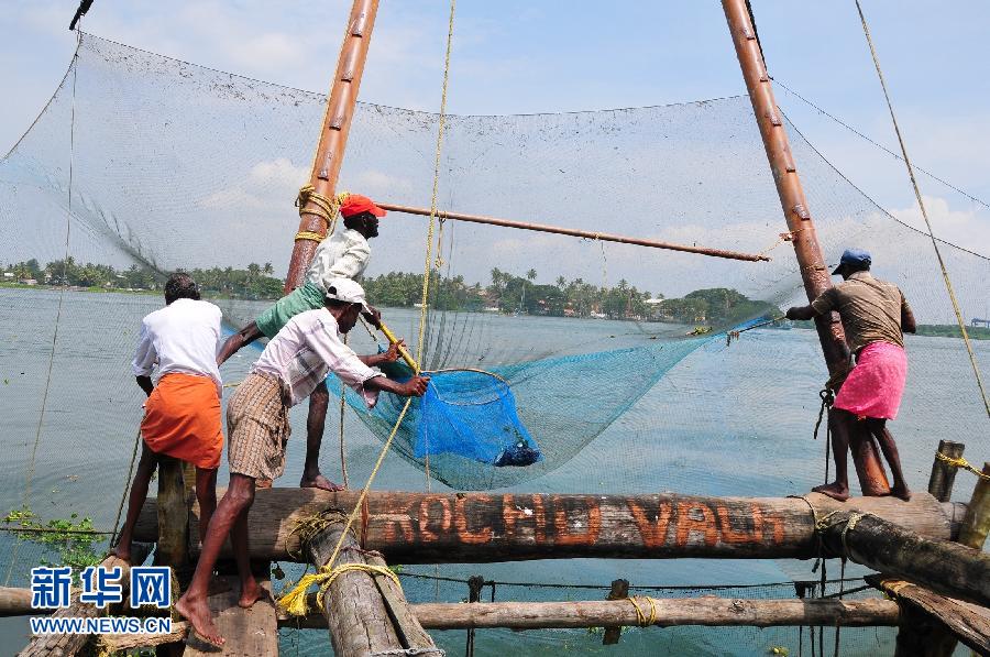 10月8日,当地渔民在印度南部港口城市科钦海边用“中国渔网”捕鱼。在印度南部最大的天然良港科钦,有一种设置在海边的独特捕鱼工具——“中国渔网”。这种捕鱼工具设计精巧,由多根十多米长的木杆撑起,散开的渔网呈辐射形。木杆控制渔网沉入海底,捞起海鱼。每户渔家都在网边盖有小屋,劳动生活都围绕这张网,是当地渔民世世代代的谋生工具。据介绍,“中国渔网”来自古代中国,通过贸易传入当地,是繁荣的“海上丝绸之路”的标志。新华社记者汪平摄