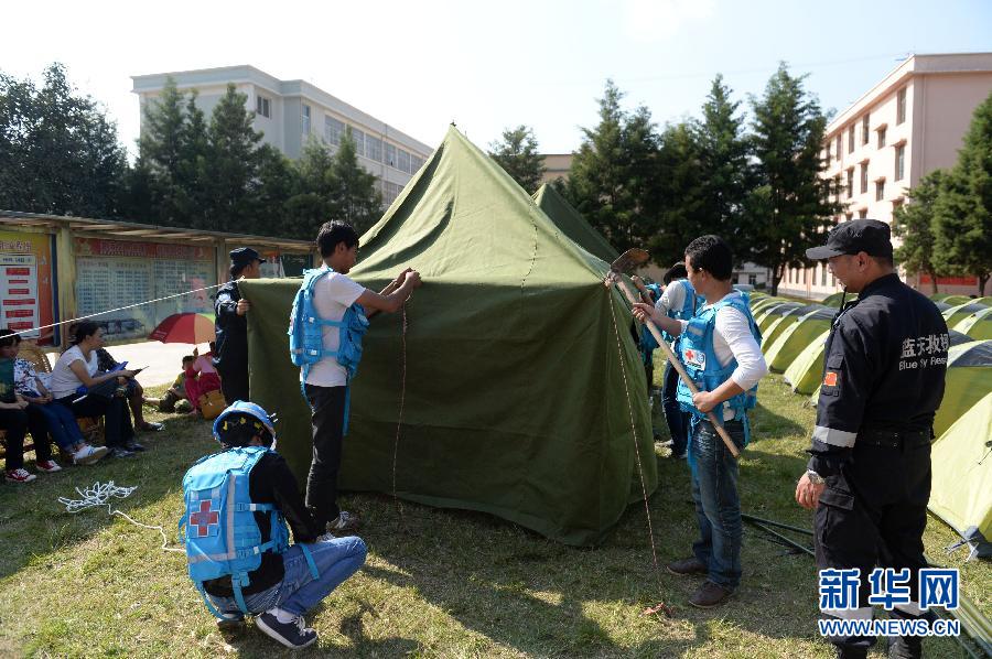 10月8日,在景谷县永平镇,蓝天救援队的工作人员在搭建帐篷。云南省普洱市景谷傣族彝族自治县北京时间10月7日21时49分发生6.6级地震。截至8日15时,地震已造成1人死亡、324人受伤、6988间房屋倒塌、5个县(区)12.46万人受灾。新华社记者胡超 摄