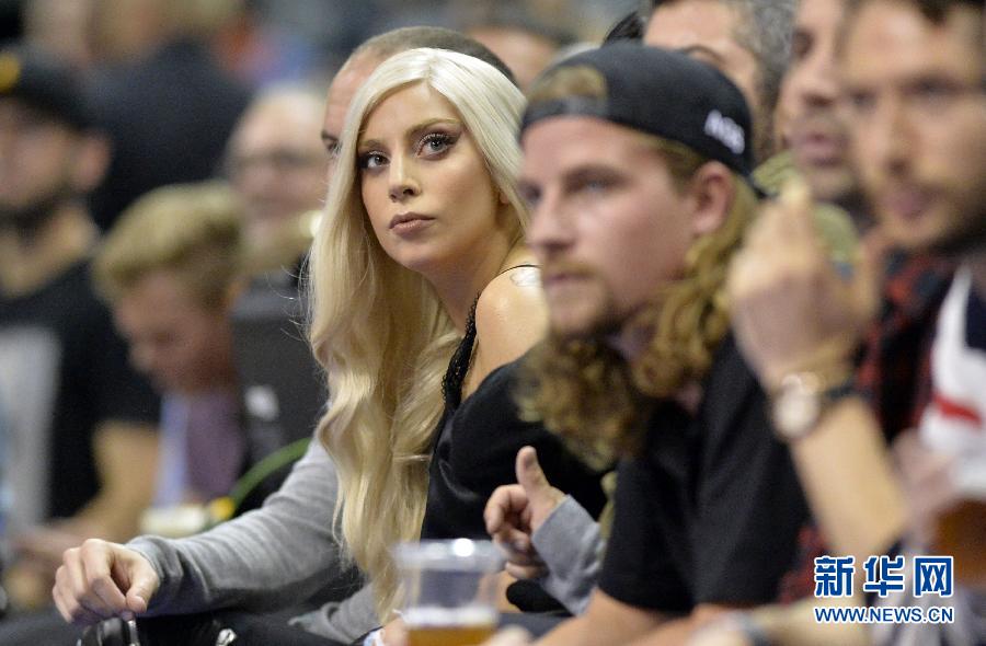 10月8日,美国流行歌手嘎嘎小姐在场边观战。当日,在2014-2015赛季NBA季前赛中,圣安东尼奥马刺队客场以93比94不敌柏林阿尔巴队。 新华社/法新