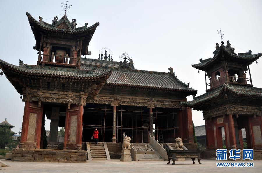 10月8日拍摄的正在修缮的稷王庙。位于山西省稷山县城中心的稷王庙是相传的后稷教民稼穑之地,庙内现存主体建筑有后稷楼、姜原殿、献殿及钟鼓二楼,为元代始建的华夏朝拜农圣的一座庙宇,2006年被国务院确定为国家重点文物保护单位。记者从稷山县文物局获悉,国家文物局今年将投资110多万元,对稷王庙献殿、钟鼓楼等文物进行保护性修缮。经过前期严格的招投标,目前稷王庙维修工程已全面启动,预计年底前将修缮完工。新华社记者 王飞航摄