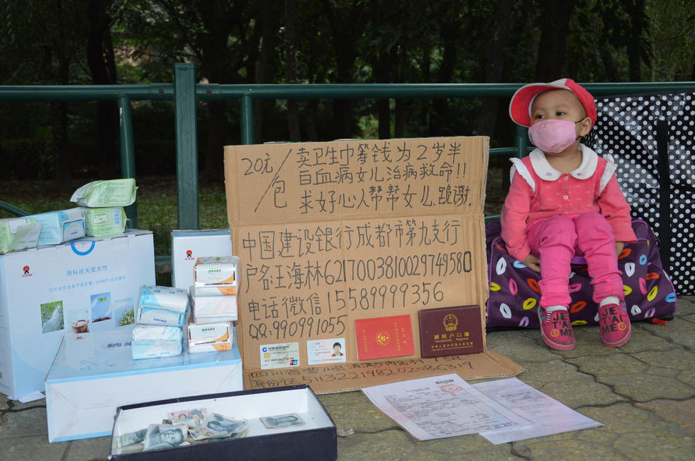 孩子的妈妈现在在山东某加油站工作,她的收入就是全家唯一的经济来源。为了多挣点钱,王海林开始出来摆摊卖卫生巾,尽可能延续孩子的生命。