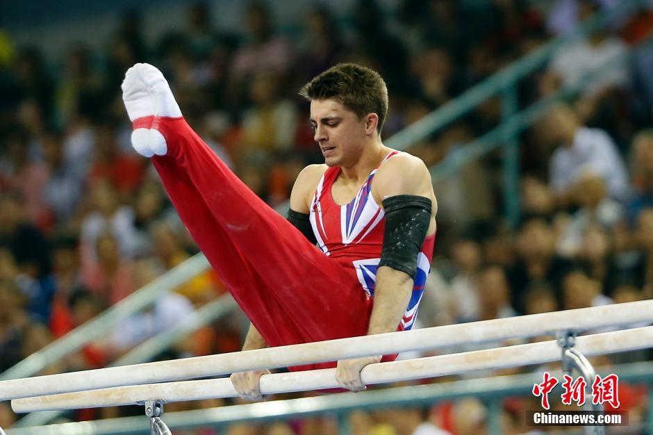10月9日,第45届体操世锦赛男子个人全能决赛在广西南宁举行,日本选手内村航平获得冠军,英国选手惠特洛克、日本选手田中佑典分获二三名。图为惠特洛克在双杠比赛中。中新社发 盛佳鹏 摄