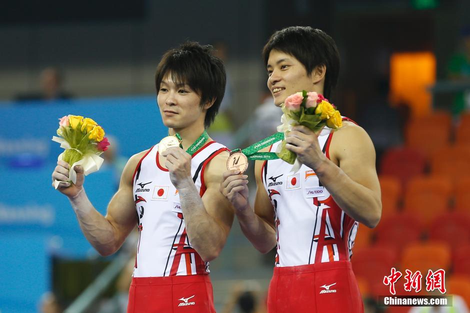 10月9日,第45届体操世锦赛男子个人全能决赛在广西南宁举行,日本选手内村航平获得冠军,英国选手惠特洛克、日本选手田中佑典分获二三名。图为内村航平(左)与田中佑典在领奖台合影。中新社发 盛佳鹏 摄