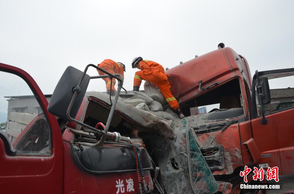 四川江油两货车相撞驾驶员被困 消防紧急营救