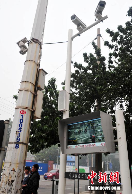 10月9日,河北石家庄行人闯红灯抓拍“神器”,严密地“监督”着通过斑马线的市民们。该“神器”为行人闯红灯自动识别抓拍系统,如果行人信号灯为红灯时,仍有市民通过斑马线,系统会自动将其人图像拍摄并形成照片到电子屏幕上。据了解,这在华北地区尚属首家。图为行人闯红灯抓拍“神器”,行人违章将被曝光。中新社发 翟羽佳 摄