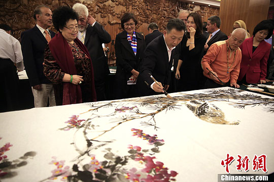 图为中国紫檀博物馆馆长陈丽华(左一)现场欣赏艺术家作画。中新社发 赵隽 摄
