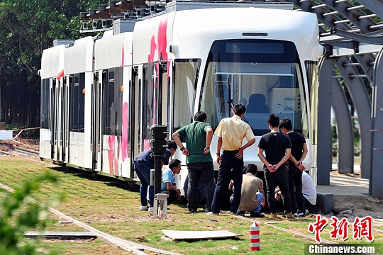 10月9日,工作人员对有轨电车进行调试。据悉,该有轨电车采用超级电容电池供电,最高时速70公里,最多可搭乘368人,将于今年底通车试用。中新社发 陈骥旻 摄