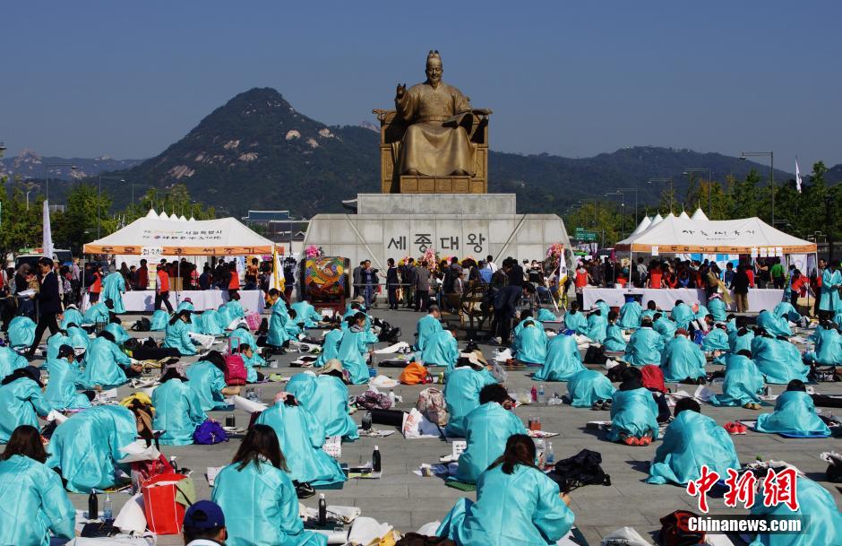 10月9日是韩国第568届韩文节,韩国首尔各地举行丰富多彩的文化活动,纪念韩文诞生568周年。韩国政府将每年的10月9日定为“韩文日”,纪念朝鲜王朝君主世宗大王创制韩文,目的在于鼓励研究和普及韩文。图为众多市民正身着传统服装在光华门广场齐书韩文。中新社发 贾天勇 摄