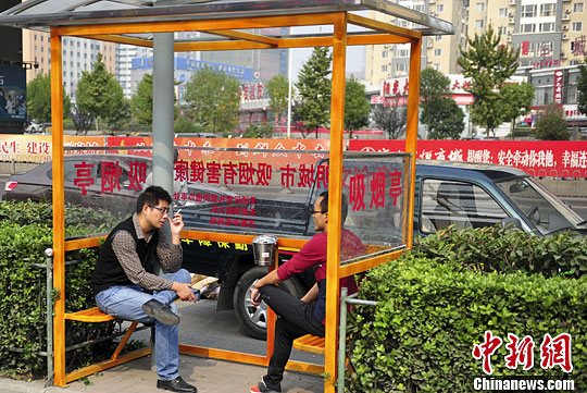 10月9日,市民在济南街头设置的“吸烟亭”内吸烟。中新社发 张勇 摄