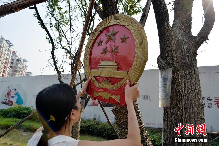 2014年10月9日,重庆,审判桌搬到人行道上、国徽挂在树杈间,一场家庭财产纠纷案在江北区石马河街道桂花园社区马路边开庭。以前的巡回法庭有进社区、村头、企业、广场,但摆在马路边,这还是第一次。图片来源:CFP视觉中国