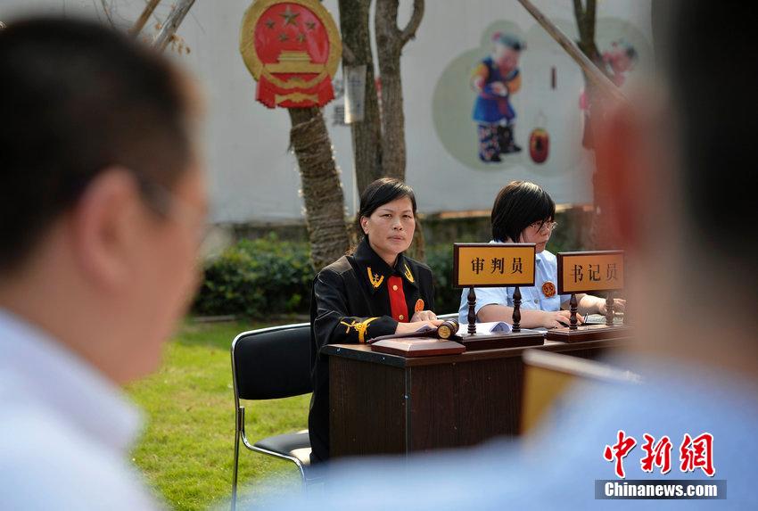 2014年10月9日,重庆,审判桌搬到人行道上、国徽挂在树杈间,一场家庭财产纠纷案在江北区石马河街道桂花园社区马路边开庭。以前的巡回法庭有进社区、村头、企业、广场,但摆在马路边,这还是第一次。图片来源:CFP视觉中国
