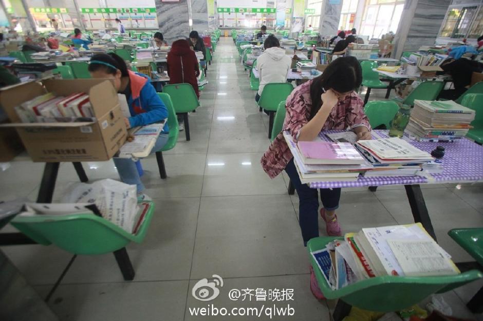 近日,济南市一高校,众多考生在学校食堂餐桌上备战考研。据了解,该大学的学生,为备战考研将食堂餐桌变成“课桌”。“这边主要以医院为主,教学楼就剩一个,除了5楼一个考研自习室,平时其他教室有课,没办法就只能来食堂复习备考。”一位考生说。 图片来源:齐鲁晚报官方微博